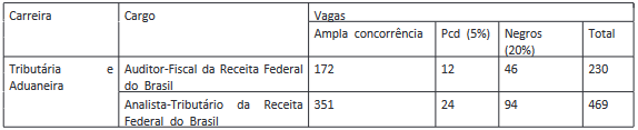 - Auditor-Fiscal da Receita Federal do Brasil: 172 vagas ampla / 12 vagas PCDs / 46 vagas cotas negros;