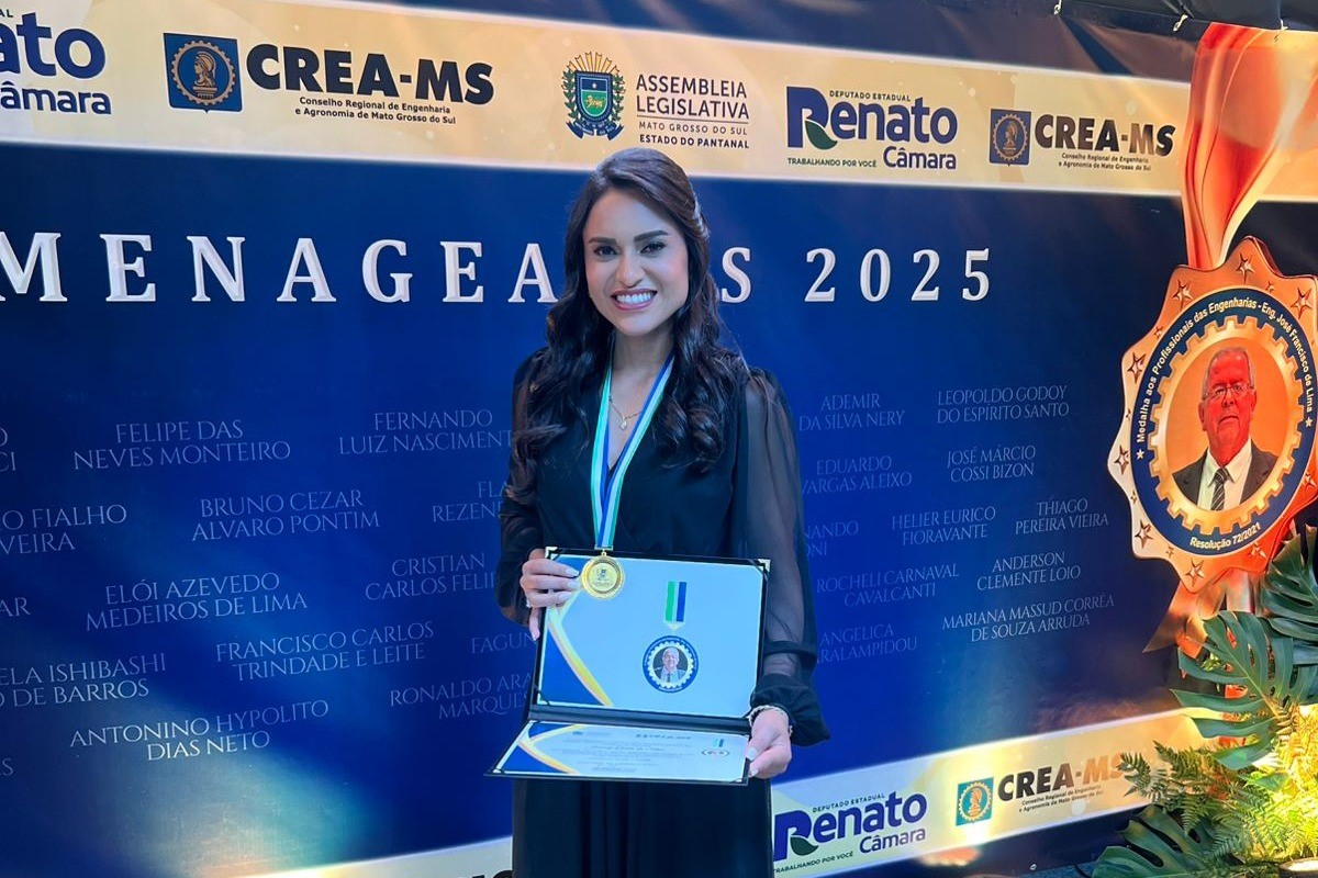 A secretária municipal de Infraestrutura e Serviços Públicos de Corumbá, Jossiely Godoi da Silva, recebeu no dia 11 de dezembro, a Medalha e o Diploma de Honra ao Mérito Legislativo Engenheiro José Francisco de Lima, durante Sessão Solene realizada no Plenário Deputado Júlio Maia, na Assembleia Legislativa de Mato Grosso do Sul (ALEMS). A honraria, considerada a mais alta distinção concedida pelo Crea-MS em parceria com o Parlamento estadual, reconhece profissionais que se destacam por sua dedicação, ética e contribuição ao desenvolvimento da Engenharia, Agronomia e Geociências. Neste ano, apenas 35 profissionais foram selecionados em todo o Estado. Parabéns Jossielly!