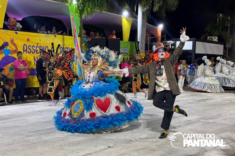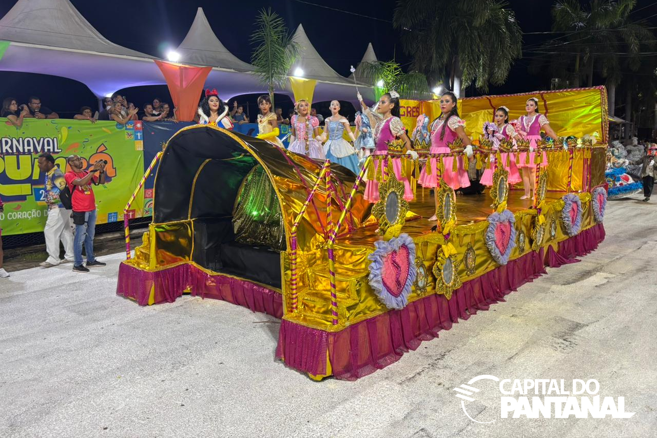 Carros alegóricos representaram contos clássicos em cenários vibrantes e cheios de brilho. Foto: Capital do PantanalAs fantasias, assinadas pela carnavalesca Lylyany Mendes, reforçaram o caráter lúdico do enredo, com tecidos leves, volumes criativos e forte presença cromática, contribuindo para a atmosfera de sonho proposta pela escola.