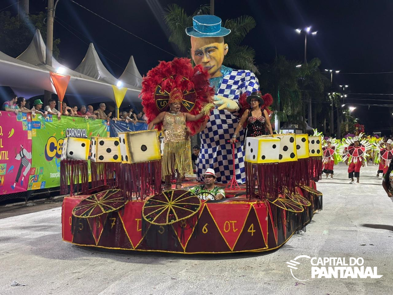 Dados, cartas e tabuleiros reforçaram a narrativa sobre risco, estratégia e destino. Foto: Capital do PantanalNa avenida, a evolução ocorreu de forma fluida, com bom deslocamento das alas e integração entre os setores do desfile. As alegorias dialogaram diretamente com o enredo, destacando tabuleiros, dados e símbolos de apostas que reforçaram as ideias de risco, estratégia e destino.