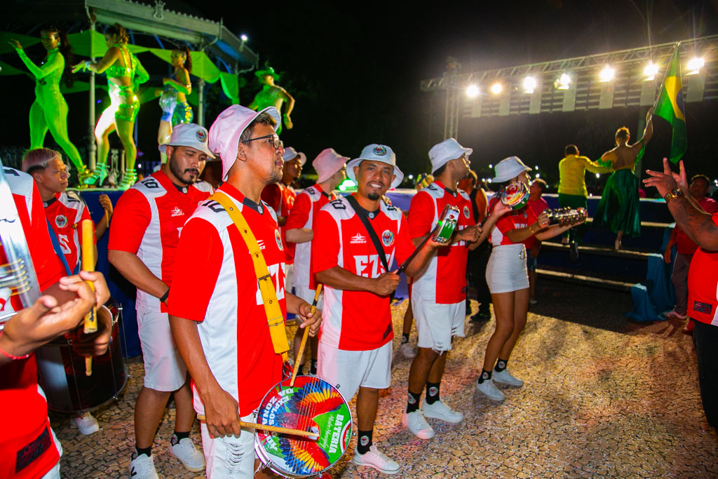 Bateria e intérpretes embalam o público durante a apresentação no lançamento do Carnaval 2026. Foto: Clóvis Neto/PMCNa sequência, bandeiras dos blocos e das escolas de samba foram apresentadas e posicionadas ao fundo da passarela, enquanto passistas se apresentavam na área central. A música Boa Tarde, Boa Tarde abriu espaço para a entrada dos casais de mestre-sala e porta-bandeira com as bandeiras do Brasil, de Mato Grosso do Sul e de Corumbá.