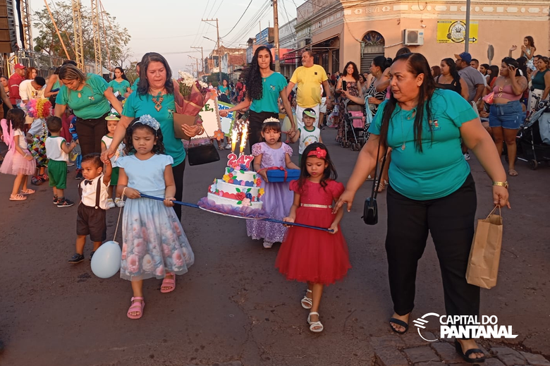 Crianças da CEMEI Neusa Assad desfilaram com um bolo cenográfico pelos 247 anos do município. (Foto: Capital do Pantanal)
