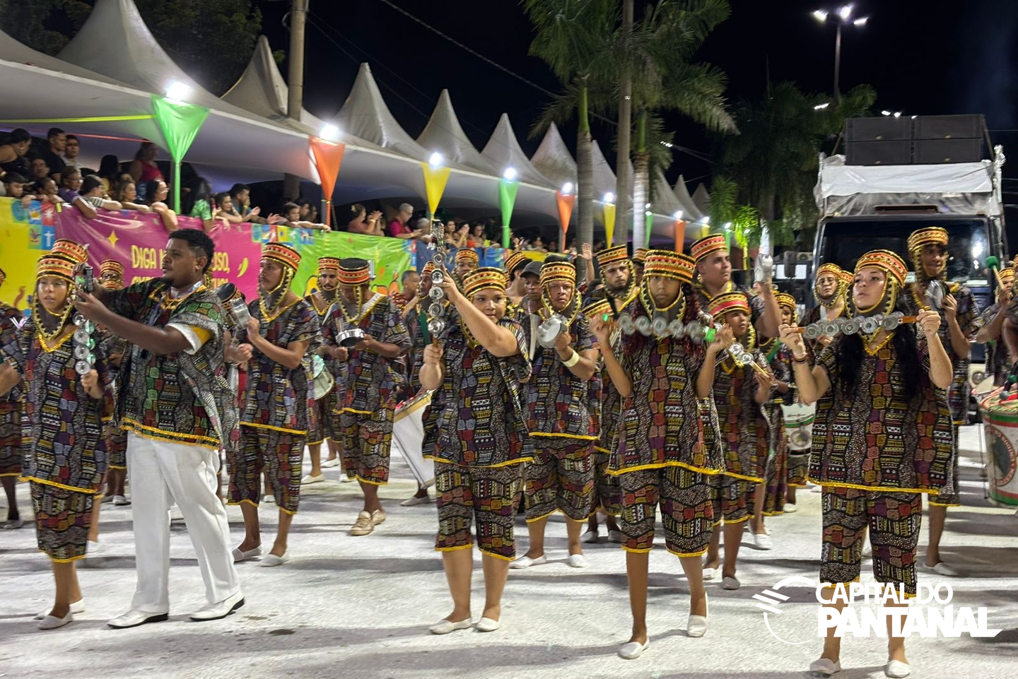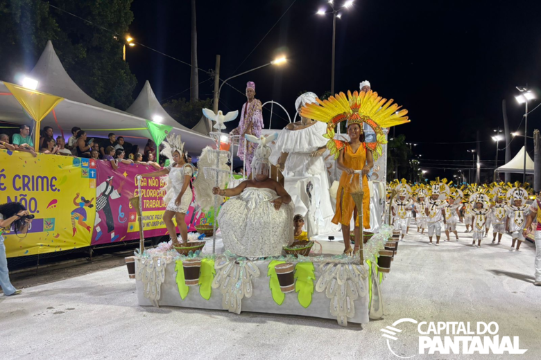 Segunda a desfilar, escola encantou com conjunto visual coeso e forte identidade cultural. (Foto: Capital do Pantanal)