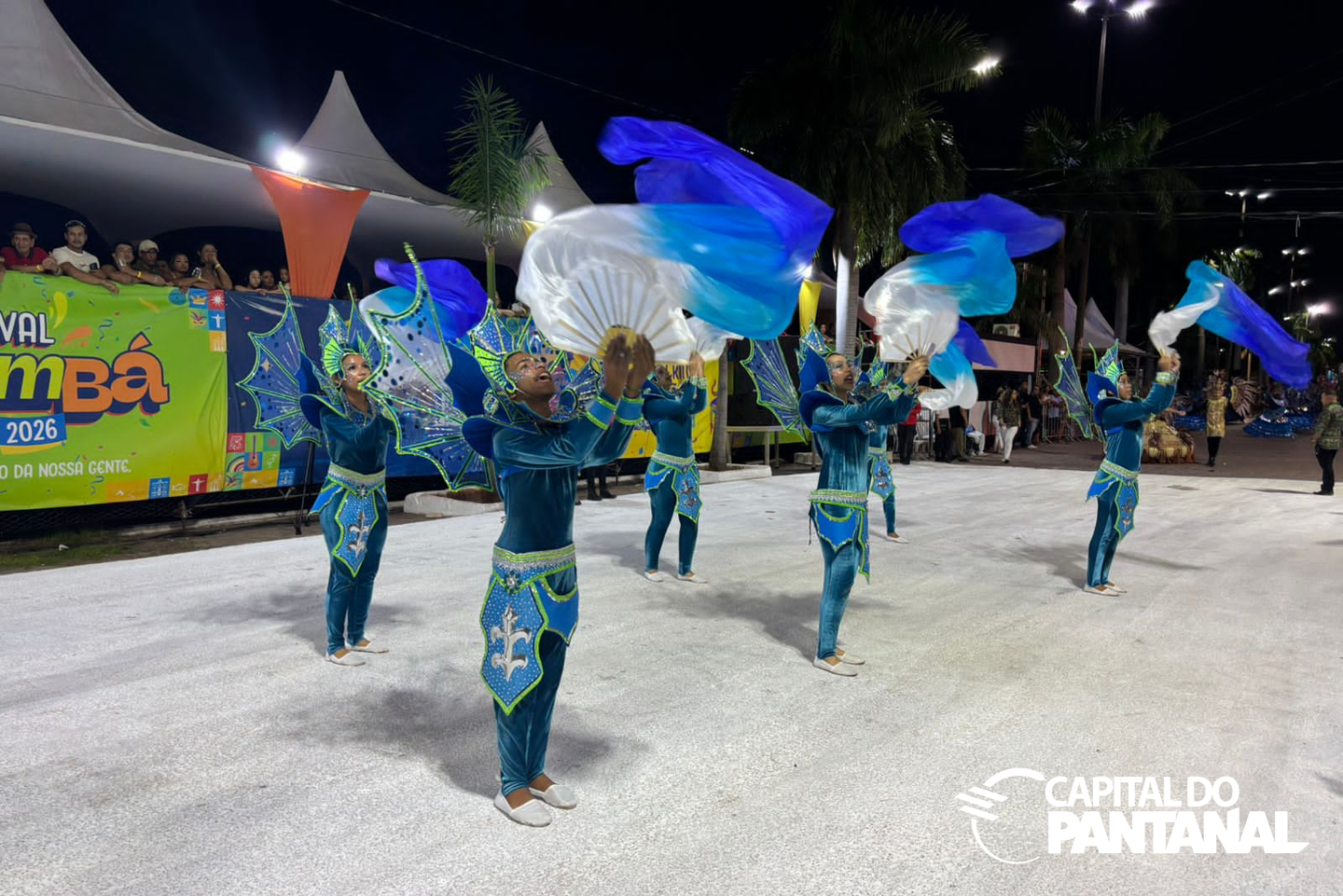 Comissão de Frente abre o desfile com elegância e conduz o público ao enredo da Estação Primeira do Pantanal. Foto: Capital do PantanalA Comissão de Frente abriu o desfile com elegância e leitura clara da proposta, conduzindo o público ao universo temático da escola com segurança cênica e sincronia. Na sequência, alas bem preenchidas e organizadas mantiveram a fluidez da evolução, sem buracos ou correria, garantindo um desfile leve e contínuo.