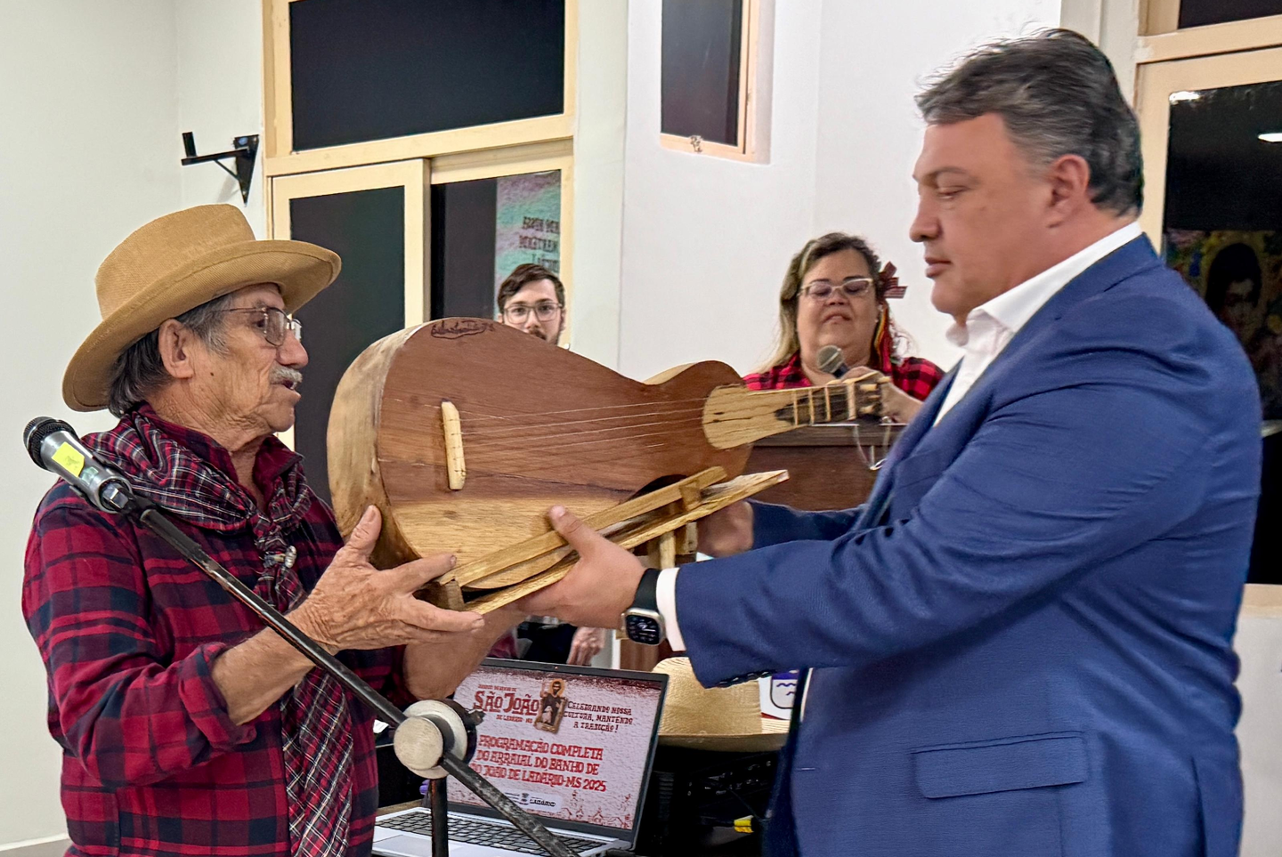 Mestre Sebastião presenteou o prefeito Munir com uma viola de cocho, símbolo da cultura pantaneira. Foto: Assessoria/PML A cerimônia de entrega de certificados aos festeiros e festeiros foi um momento de grande reconhecimento e importância para os homenageados, pois serve como comprovação do tempo de atuação em qualquer ação de política pública para a cultura, sendo um portfólio valioso para editais futuros. Os festeiros certificados pela Prefeitura de Ladário poderão contar com uma ajuda de custo para a realização da confecção dos andores. Haverá bandinha para acompanhar todos os festeiros, queima de fogos e concursos, incentivando a todos a descerem até o Rio Paraguai para o banho no São João.