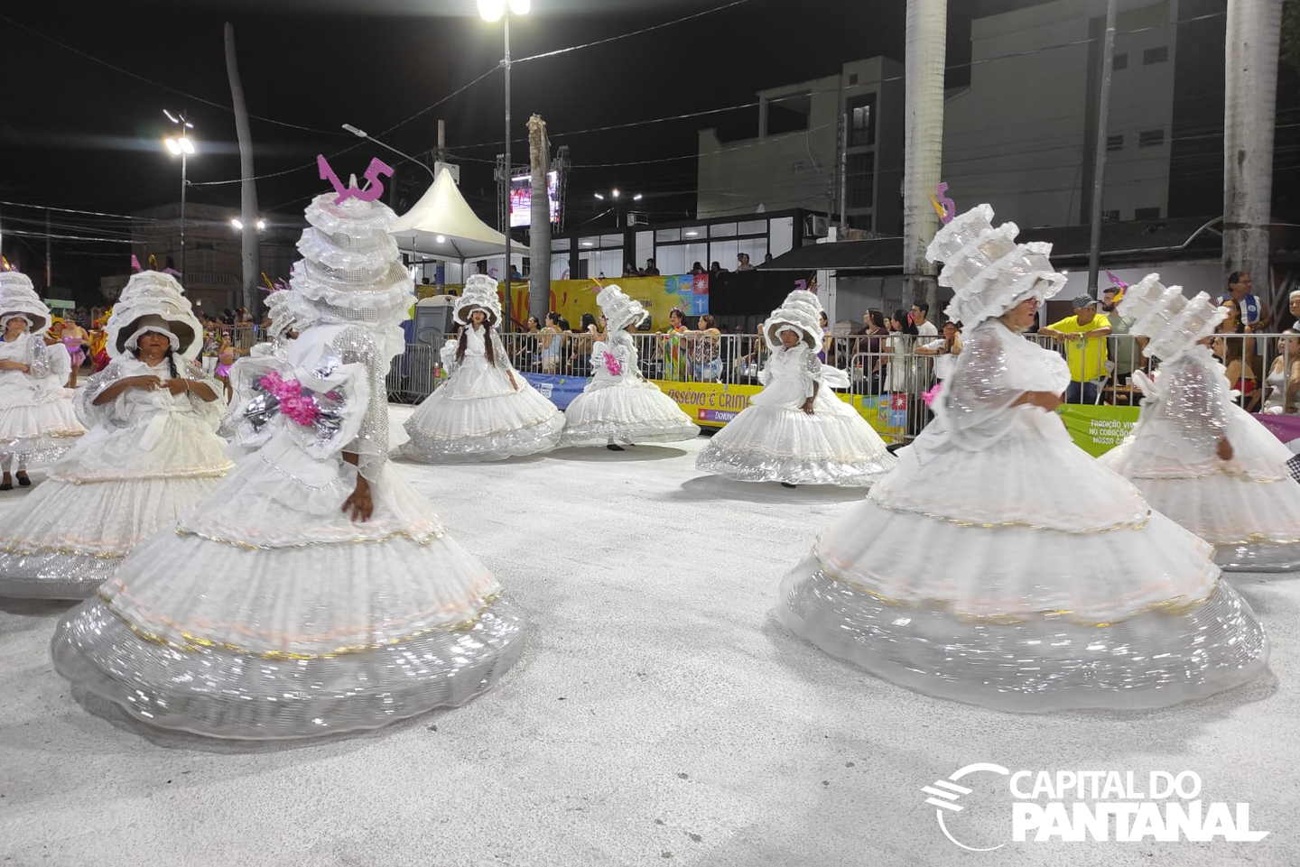 Ala das Baianas encanta ao desfilar como debutantes, com vestidos elegantes e bolos de 15 anos na cabeça. Foto: Capital do PantanalO desfile reuniu cerca de 600 componentes, distribuídos em 16 alas, incluindo passistas, bateria e baianas, além de quatro alegorias que ajudaram a contar a história da escola desde suas origens até o futuro sonhado pela comunidade.