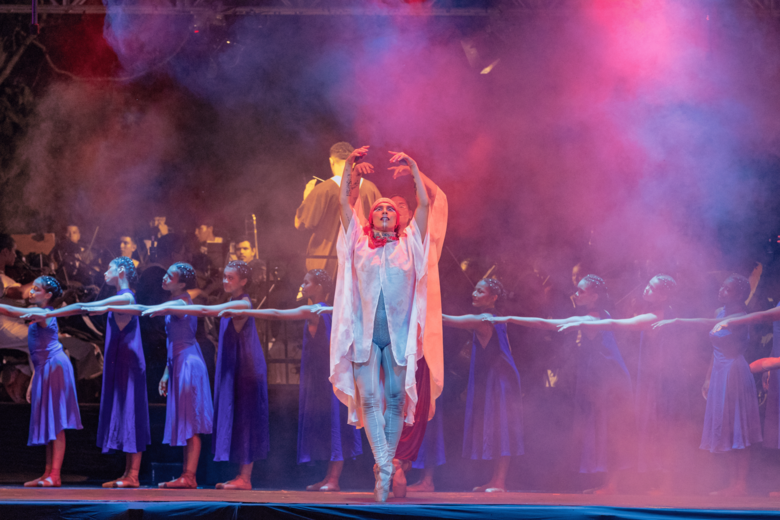 A edição deste ano teve como fio condutor o Peabirú, antigo caminho indígena que atravessa a América do Sul e que, no espetáculo, foi representado por meio de uma metáfora inspirada nos jogos de amarelinha. A proposta transformou o percurso em uma travessia simbólica, marcada por equilíbrio, desafios e descobertas. “É um caminho de autoconhecimento. A gente sai da terra, vai se equilibrando, às vezes volta uma casa, às vezes tenta pular etapas e se desequilibra, até conseguir chegar ao céu. Fizemos essa metáfora junto com o Peabirú, que entendemos como o caminho que leva ao céu, mas também como um caminho interior”, explica Márcia Rolon, diretora artística do Moinho Cultural.