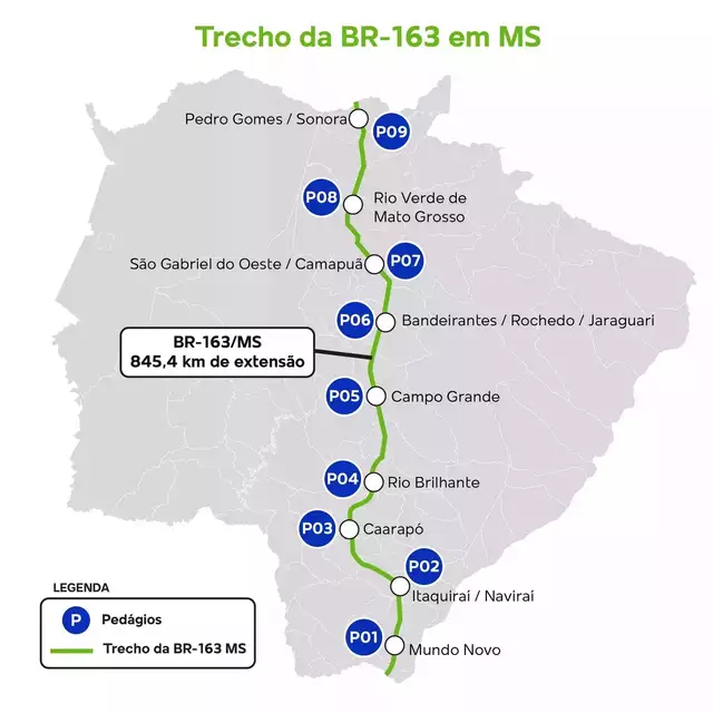 Trecho da BR-163 em Mato Grosso do Sul que está sob gestão da CCR. Arte: Campo Grande NewsA tarifa de pedágio estabelecida no edital foi fixada em R$ 7,52 por cada 100 km. Caso houvesse concorrência e alguma empresa apresentasse uma proposta com valor inferior, a atual concessionária teria o direito de cobrir o lance. No entanto, como somente a Motiva, sucessora da CCR MSVia, apresentou proposta, o leilão não terá disputa e servirá apenas para homologar a concessão nas mãos da empresa.