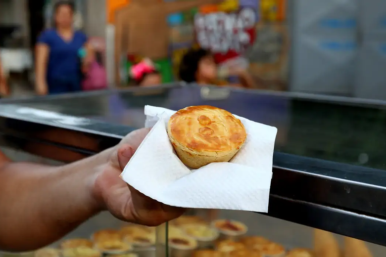 Pessoa mostrando empadinha em lanchonete. (Foto: Tânia Rego/Agência Brasil)