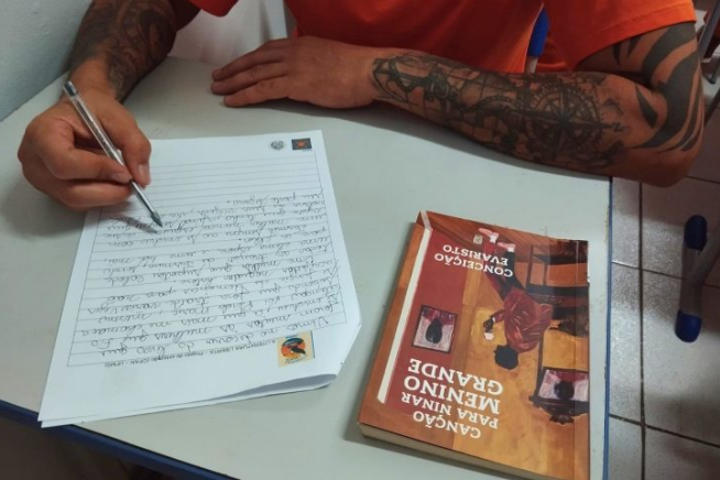 Pessoa privada de liberdade escrevendo texto sobre livro. (Foto: Agepen/Divulgação)