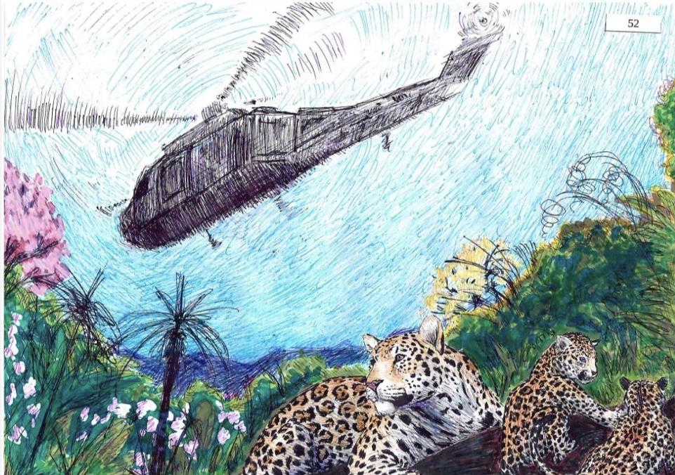 O talento de uma das estudantes vencedoras do concurso impressiona. Foto: Divulgação Rafael de Azevedo conta que o talento das crianças têm surpreendido à todos no Esquadrão. Em especial, ele destacou a criação de uma aluna que conseguiu retratar com sensibilidade a beleza do Pantanal e, ao mesmo tempo, transmitir a ideia de movimento do helicóptero com uma naturalidade impressionante. "Ficou evidente que ela possui um talento que merece ser incentivado e desenvolvido pelos seus responsáveis", disse.