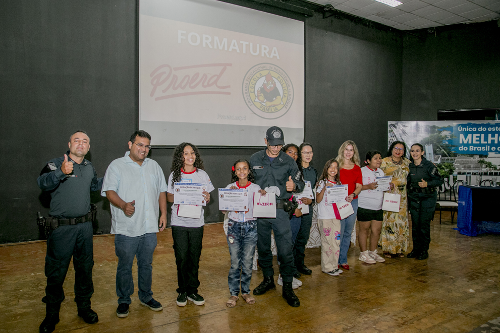 Estudantes receberam certificado de destaque pela participação em concurso de redação e desenho. Foto: Renê Marcio Carneiro/PMCDurante a solenidade de formatura também foram premiadas as redações dos participantes do PROERD, que foram escolhidas por policiais militares do 6º Batalhão de Polícia Militar. Foram elas: Sofia Montenegro de Oliveira (Escola Municipal Almirante Tamandaré), Melyssa Victória Cardoso Nogueira (Escola Municipal CAIC Padre Ernesto Sassida), Rihanna Viana Coelho da Silva (Escola Municipal Delcídio do Amaral), Maria Helena Sorrilha de Jesus (Escola Municipal Luiz Feitosa Rodrigues) e Maria Lucia Galvez Beltran (Escola Municipal Pedro Paulo de Medeiros).