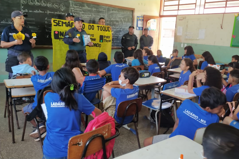 Em Ladário, 56 alunos da Escola Municipal Marques de Tamandaré participaram de uma atividade conduzida pelas equipes do Proerd, Promuse e Guarda Municipal. Na Escola Municipal Nelson Mangabeira, outros 20 estudantes receberam as orientações no período vespertino.