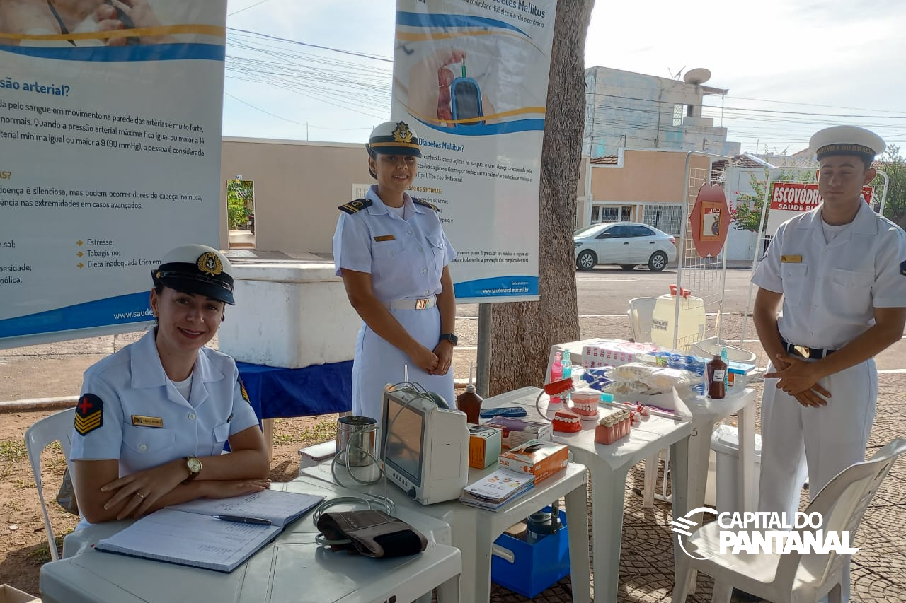 Equipe de médica da Marinha realzia aferição de pressão arterial e orienta sobre a higienização bucal. Foto: Capital do PantanalO Contra-Almirante Amendoeira destaca ainda que no Comando do 6º Distrito Naval, estreitar os laços com com a população local é algo de grande importância. "A apresentação da Banda de Música em Ladário, as ações cívico-sociais e a exposição de equipamentos militares são exemplos desse esforço de aproximação", destaca.