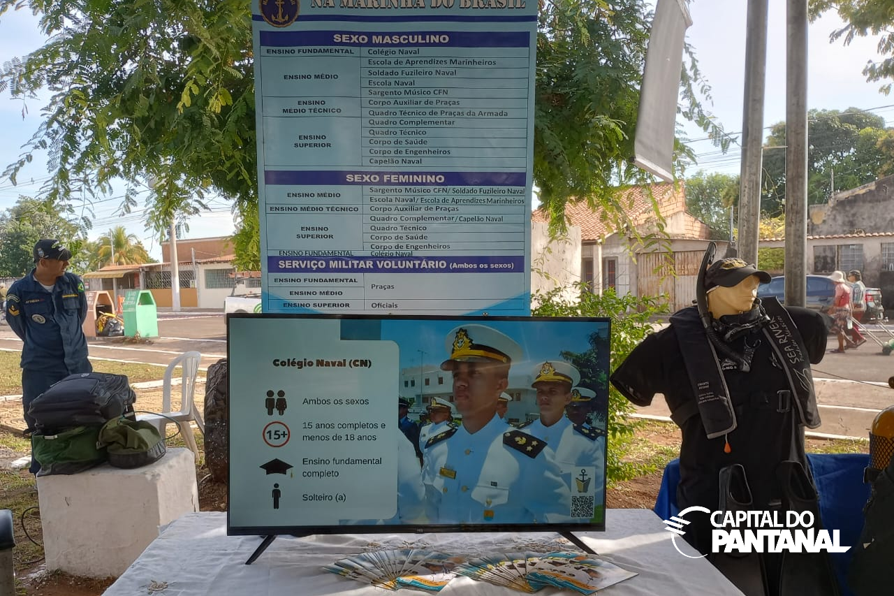 No evento a população recebe orientações sobre como ingressar na Marinha do Brasil. Foto: Capital do Pantanal Laysa Moura, presidente da associação, explica que na ação de hoje, 25 associadas estão participando com seus diferentes nichos de atuação. Laysa diz que a associação é uma oportunidade para as mulheres desenvolverem seus talentos e usarem disso comercialmente. "Muitas de nós saímos da nossa cidade para acompanhar o marido, deixando nossa profissão e emprego. Através da associação, nos apoiamos e criamos uma rede de apoio", disse.