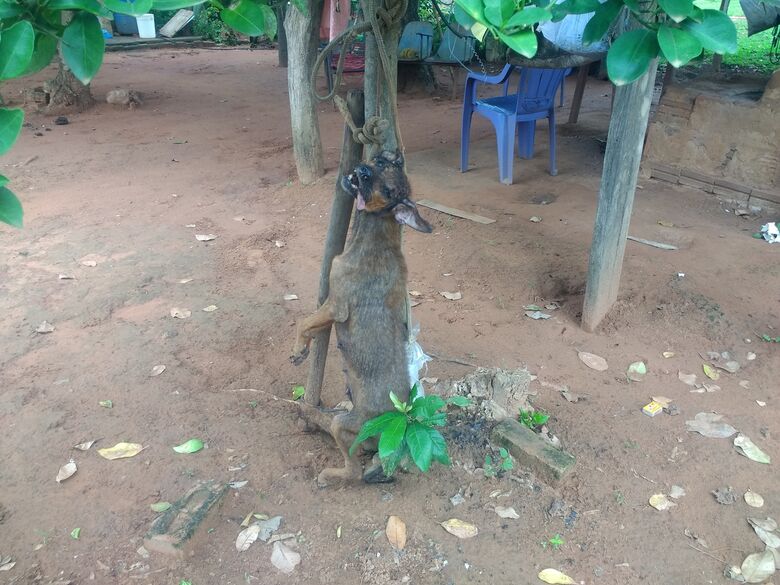 No local, a Polícia Militar Ambiental (PMA) encontrou o animal sem raça definida, já sem vida. O cão estava pendurado em uma árvore pelo pescoço, com diversas marcas de golpes de machado na cabeça.