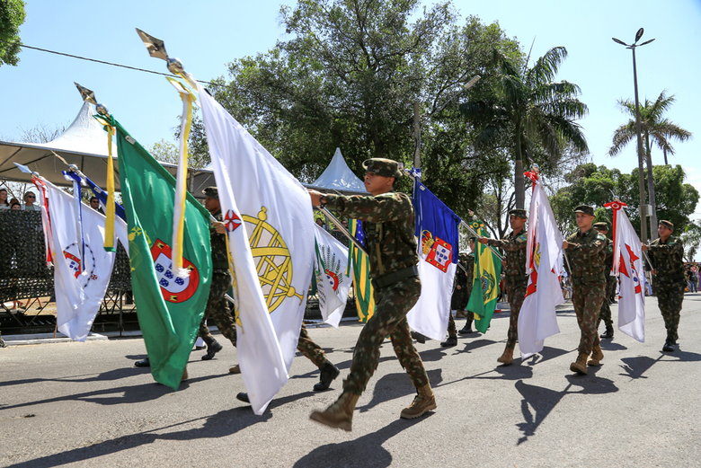 Bandeiras históricas usadas entre 1500 até a proclamação da república foi história viva desfilando na Avenida General Rondon. (Foto: Renê Marcio Carneiro/PMC)