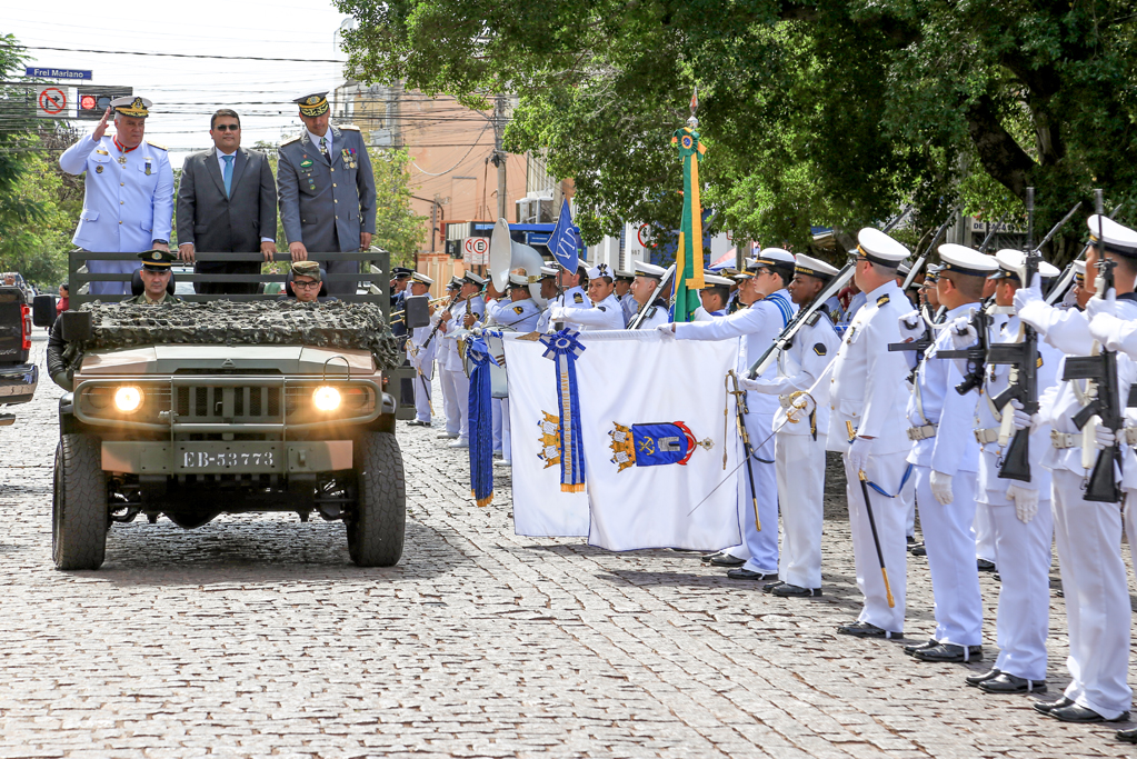 Prefeito Gabriel de Oliveira (ao centro), desfilou em carro aberto até o palanque oficial. Foto: Renê Marcio Carneiro/PMCTambém acompanharam o evento o comandante do 6º Distrito Naval, contra-almirante Alexandre Amendoeira Nunes, e o comandante da 18ª Brigada de Infantaria Pantanal, general de brigada José Fernandes Carneiro dos Santos Filho, além de secretários municipais, vereadores e representantes de instituições civis.