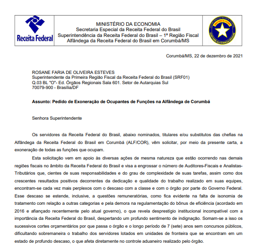 Nesta quarta-feira (22), servidores da Receita Federal, que atuam na Alfândega de Corumbá, divulgaram carta onde solicitam exoneração de suas funções nos serviços aduaneiros na Fronteira de Corumbá com a Bolívia.