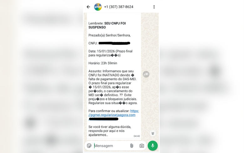 A mensagem é enviada por um número de telefone internacional e utiliza uma imagem do "gov.br" como perfil para transmitir veracidade, mas é tudo "fake". No texto, o golpe utiliza uma abordagem de emergência e prazos curtos, a intenção é que o usuário fique desesperado e clique no link enviado. A mensagem falsa informa que o CNPJ foi desativado devido a falta de pagamento do tributo mensal obrigatório, o DAS-MEI, e oferece uma solução para que seja evitado o cancelamento definitivo do Mei, além de bloqueios judiciais. Em seguida, pede que o usuário clique no link para fazer a regularização imediata.