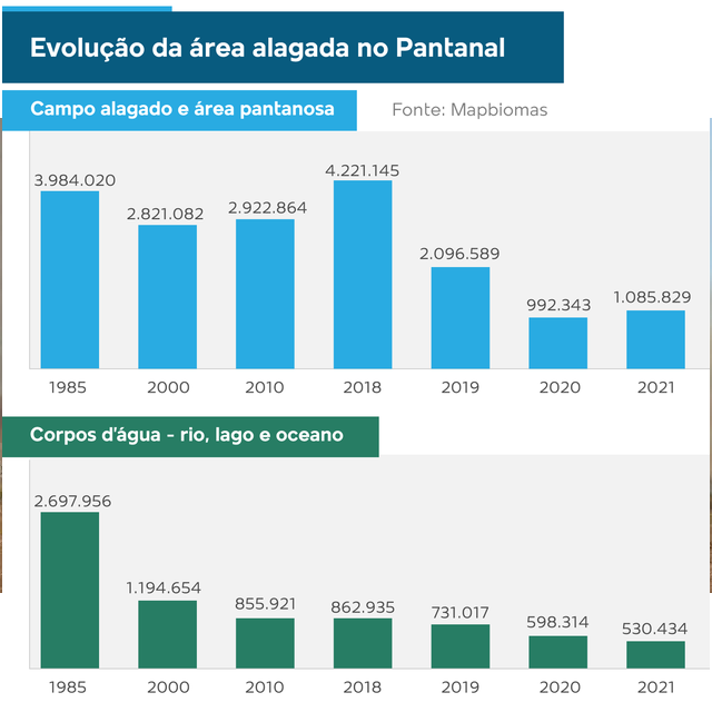 Para ele – e estudos que têm sido feitos – a indicação de uma boa recuperação passa por ter a fauna perdida recomposta (com todas as espécies vegetais que foram queimadas) e manutenção ou aumento das áreas alagadas. Elas diminuíram, em 37 anos, cerca de 80%, saindo de uma superfície de 2,6 milhões hectares em 1985 para apenas 530,4 mil hectares em 2021.