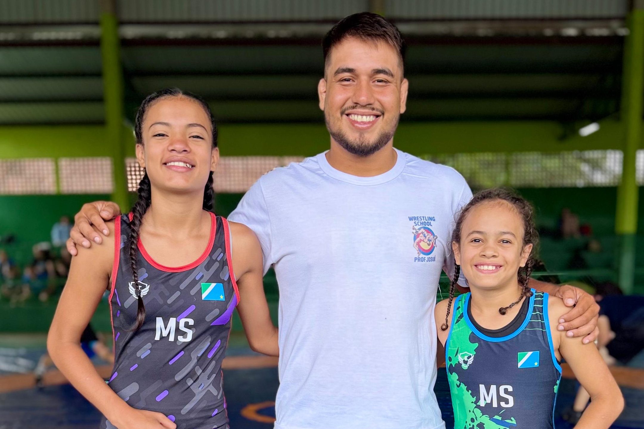 Rebeca e Maria Eduarda com o treinador Josué Carvalho. Foto: Arquivo Pessoal Rebeca Carvalho, de 10 anos, foi um dos principais nomes dessa caminhada. Em uma temporada marcada por regularidade e evolução técnica, ela conquistou títulos importantes, como campeã do Circuito Sul-Sudeste, campeã brasileira infantil, campeã estadual de Beach Wrestling e campeã estadual de Wrestling. Maria Eduarda, de 12 anos, também encerrou o ano em evidência, com medalha de bronze nos JEBs Sub-14 e títulos estaduais tanto no Beach Wrestling quanto no estilo livre feminino.