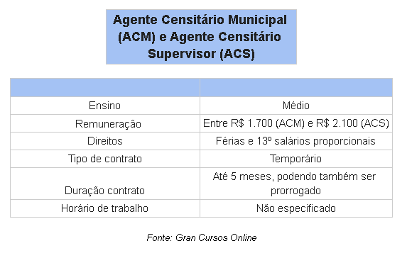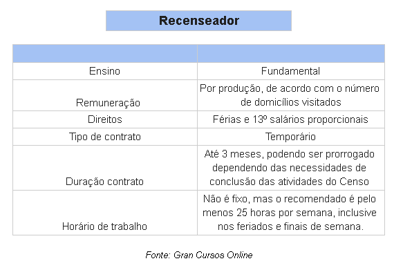 Os cargos disponíveis para esse certame são de recenseador, agente censitário municipal e agente censitário supervisor. Veja abaixo a tabela, com os requisitos necessários, remuneração, duração do contrato, cargos e benefícios: