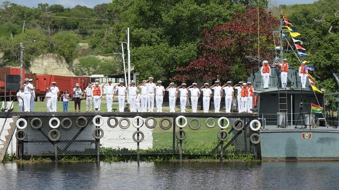Momento da recepção dos miloitares da Marinha do Brasil na Base Naval do Tamengo, na Bolívia. Foto: Divulgação/MBPara aquisição dos dados batimétricos, serão empregadas duas Lanchas de Sondagem, que percorrerão a extensão de 10 km, garantindo 4 km2 de área sondada. Além disso, serão adquiridos dados topogeodésicos de pontos notáveis à navegação, os quais subsidiarão elementos para atualização de três documentos náuticos da região. Em proveito à missão, 19 sinais de Auxílios à Navegação, sendo nove deles dispostos ao longo do Canal do Tamengo, serão inspecionados.