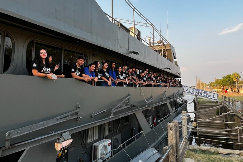 No primeiro dia de ações cívico-sociais da Operação Ágata 2023, 50 jovens aprendizes visitaram navio da Marinha em Porto Murtinho. (Foto: Divulgação/MB)