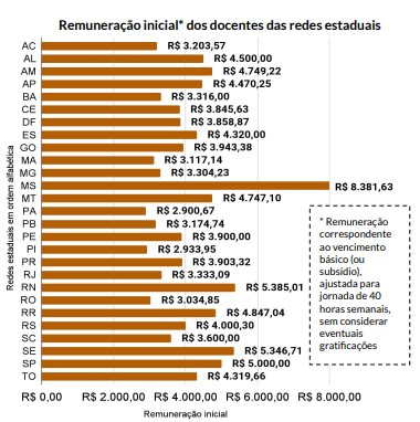 De acordo com o ranking dos estados brasileiros, o maior salário para professor no país é pago pelo Governo de Mato Grosso do Sul (MS). A remuneração inicial na Rede Estadual de Ensino é de R$ 8.381,63 para professor graduado com carga de 40h/aula. Nessa mesma faixa, o professor com habilitação superior, sem nenhum adicional ou gratificação, pode atingir salário de R$ 12.237,18 na evolução da carreira e atingir vencimento de 17.132,05 no topo com a soma dos adicionais por tempo de serviço.