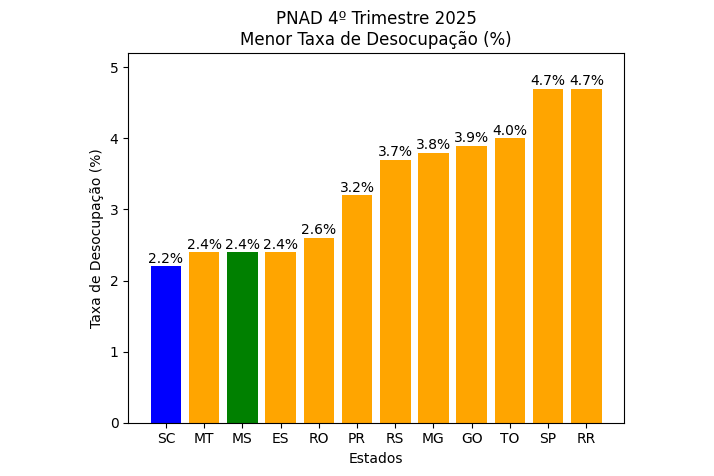 Mato Grosso do Sul registrou taxa de desocupação de 2,4%, no último trimestre de 2025. O índice é o menor da série histórica do Estado e a 2ª menor taxa do país. Os dados foram elaborados pela Assessoria Especial de Economia e Estatística da Semadesc (Secretaria de Estado de Meio Ambiente, Desenvolvimento, Ciência, Tecnologia e Inovação). O levantamento aponta que o nível de ocupação ficou em 62,4%, sendo a 9ª maior taxa do Brasil, com aumento de 0,6 p.p. em relação ao trimestre anterior.