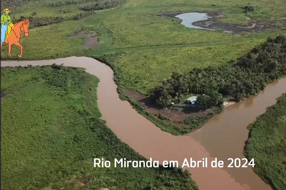 Em 2023, o rio estava com maior volume de água e margeado pela vegetação. Foto: Reprodução vídeo/IHPFormado pelo Rio Roncador e Córrego Fundo, em Jardim, o Miranda percorre 490 quilômetros até a foz no Rio Paraguai, já no município de Corumbá. Nesta viagem, passa por Bonito. De lá, veio outra imagem, divulgada em 22 de março pelo Instituto SOS Pantanal, que ajuda a dimensionar a gravidade da seca em 2024. Pescadores e ribeirinhos conseguiam caminhar no que um dia foi as profundezas do Miranda, que tinha aproximadamente 10 metros.