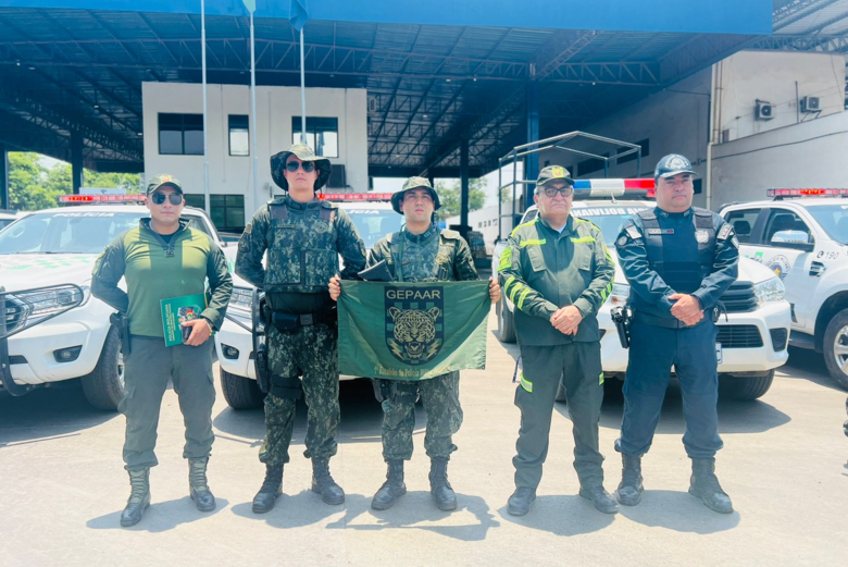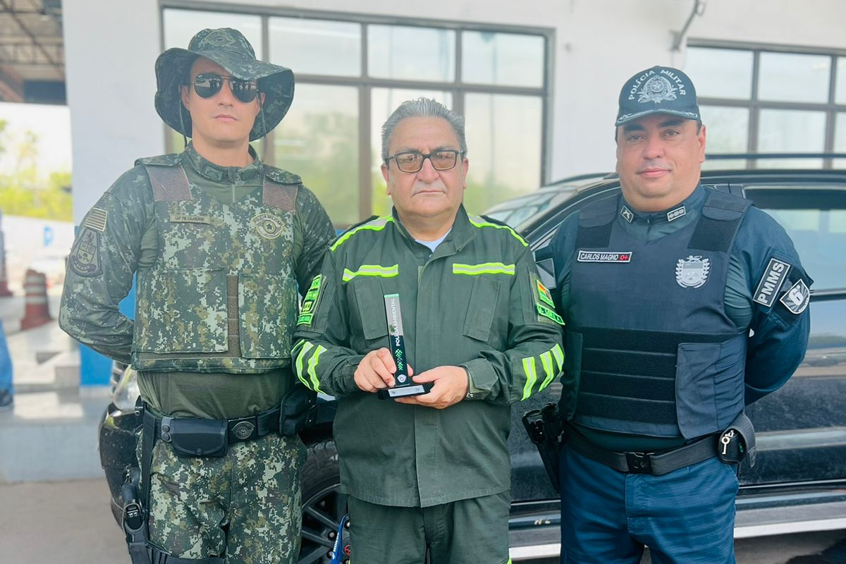 Javier Cotoca, Comandante da Fronteira da Polícia Nacional Boliviana, foi homenageado pela contribuição à operação. Foto: Divulgação/PM-MSDurante o evento de encerramento na fronteira, o Policiamento Ambiental homenageou ao Comandante da Fronteira da Polícia Nacional Boliviana, Sr. Javier Lora Cotoca, e reforçou a agradecimento ao Cmt do 6 BPM-MS pela recepção e acolhida no município de Corumbá.