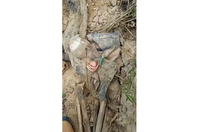 Junto à ossada foram localizados uma prótese dentária e pedaços de roupa, o que reforça a suspeita de se tratar de restos humanos.