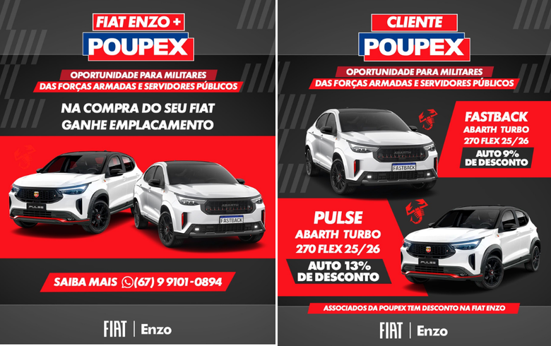 O grupo Stellantis firmou parceria com a Poupex. No Mato Grosso do Sul, a Fiat Enzo — representante das marcas Fiat e Abarth — passa a oferecer descontos e condições especiais na aquisição de veículos a militares da ativa e da reserva, servidores públicos federais, estaduais e municipais, além de pensionistas, filhos e cônjuges.