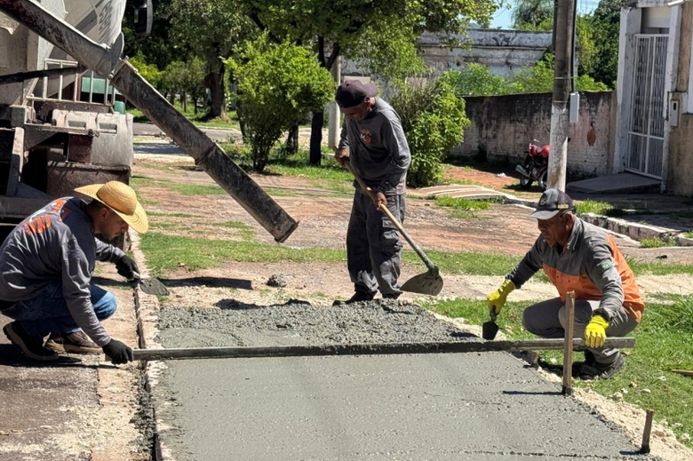 As intervenções incluem a preparação do solo e a concretagem dos passeios, com foco na melhoria da circulação de pedestres e na organização dos espaços públicos. A execução ocorre de forma planejada e com acompanhamento técnico da Prefeitura de Ladário.
