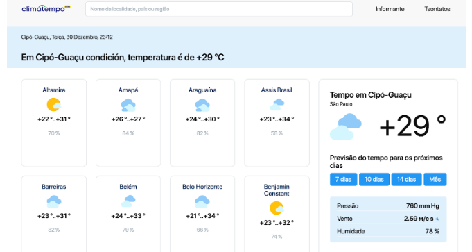 O Instituto Nacional de Meteorologia (Inmet) emitiu aviso de chuvas intensas válido das 0h às 23h59. A previsão indica pancadas de chuva com volumes entre 20 e 50 mm/dia, ventos de 40 a 60 km/h e baixo risco de alagamentos, queda de galhos e descargas elétricas. Em áreas mais afetadas, os volumes podem chegar a 100 mm/dia e rajadas de vento de 60 a 100 km/h.