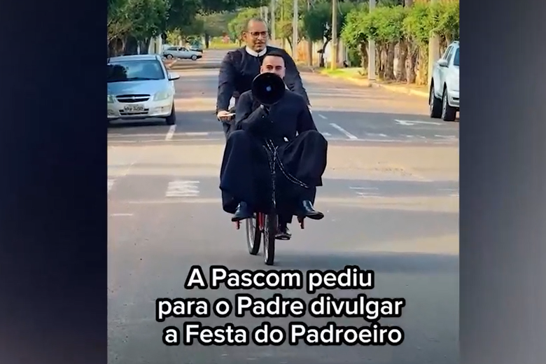 Todo mundo se encantou com os padres Matheus Rocha e Emmanuel Pavon, do Santuário Diocesano de Nova Andradina, que, na semana passada, resolveram mostrar que padre também tem humor. Eles subiram em uma bike vermelha e usaram um megafone para divulgar a festa da igreja. O vídeo passou de um milhão de visualizações e acumula quase 7 mil comentários.