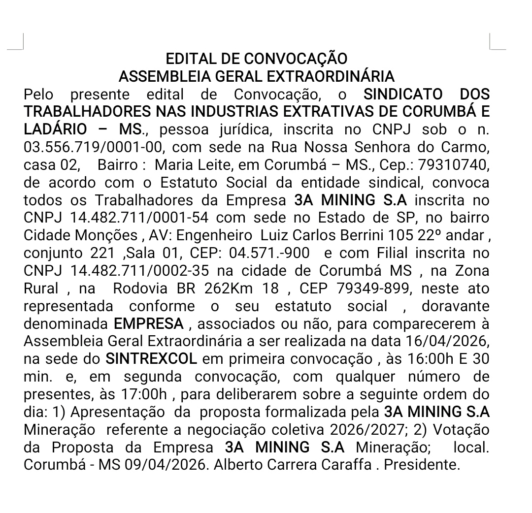 O Sindicato dos Trabalhadores nas Indústrias Extrativas de Corumbá e Ladário – MS (SINTREXCOL), pessoa jurídica inscrita no CNPJ nº 03.556.719/0001-00, com sede na Rua Nossa Senhora do Carmo, casa 02, bairro Maria Leite, em Corumbá – MS, CEP 79310-740, no uso de suas atribuições estatutárias, convoca todos os trabalhadores da empresa 3A MINING S.A, associados ou não, para participarem da Assembleia Geral Extraordinária.