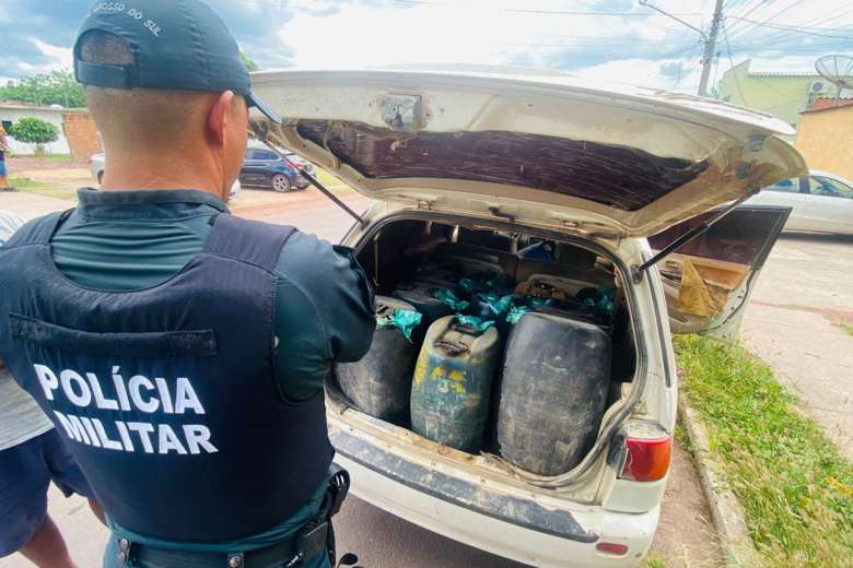 Durante serviço de ronda ostensiva, realizado pela equipe da Rádio Patrulha da Polícia Militar (PM), na tarde desta quinta-feira (13), um carro de cor branca, com placas estrangeiras, foi flagrado transportando dezenas de galões com combustível boliviano de origem ilegal em Corumbá.