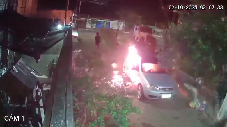 Câmeras de segurança registraram o momento em que a dupla chegou em uma motocicleta por volta das 03 horas da madrugada. Um deles desceu da moto, atirou uma pedra no vidro carro, jogou um líquido inflamável dentro do veículo, ateou fogo e saiu em fuga.