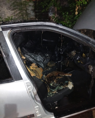 Carro teve o interior todo destruído pelo fogo. Foto: CBMMSO morador acordou com o barulho do alarme e dos cães latindo. Ao se deparar com o fogo, teve a ação de iniciar o combate às chamas com a mangueira do próprio quintal. Quando os Bombeiros chegaram no local, o fogo já estava controlado, eles realizaram o rescaldo e constataram que o interior do carro havia sido totalmente destruído.