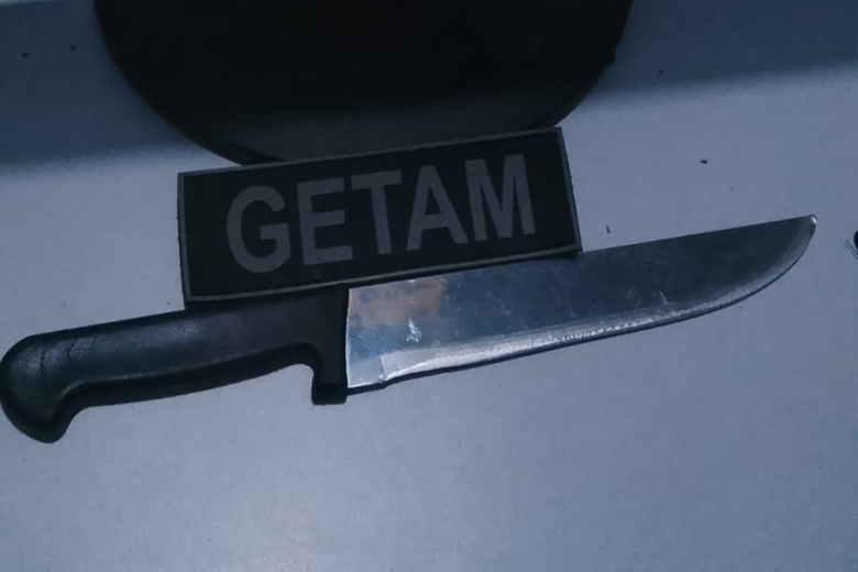 Após a abordagem e revista pessoal, a equipe encontrou com o indivíduo uma faca com lâmina de aproximadamente 30 centímetros. Além de portar a arma branca, o homem desacatou os policiais com ofensas durante a ocorrência, agravando sua situação perante a autoridade policial.