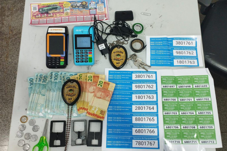 Polícia localizou com o autor: Dinheiro em espécie, máquinas de cartão, dispositivos chupa-cabra e adesivos falsos de suporte ao cliente. (Foto: Divulgação/PCMS)