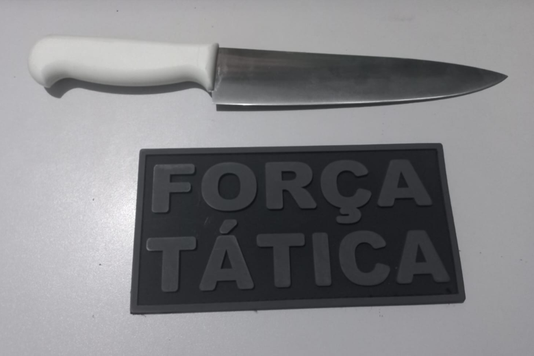 Ao chegar no local, a equipe tática da PM encontrou o suspeito em visível estado de embriaguez. Durante a abordagem, foi confirmado que ele portava uma faca com aproximadamente 15 cm de lâmina.