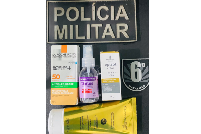 No local, foram encontrados itens de higiene pessoal e cosméticos, que haviam sido levados da farmácia. Os produtos foram apreendidos e encaminhados à Delegacia de Polícia Civil.