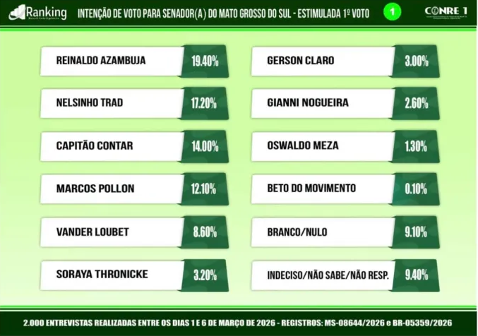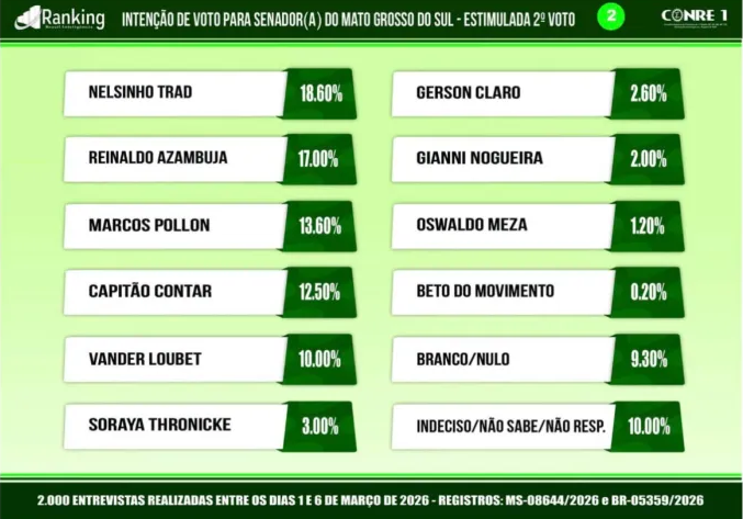 A pesquisa ouviu 2 mil eleitores entre os dias 1º e 6 de março. O levantamento foi registrado na Justiça Eleitoral sob os números MS-08644/2026 e BR-05359/2026, com margem de erro de 2,2 pontos percentuais e nível de confiança de 95%.*Com informações do InvestigaMS.
