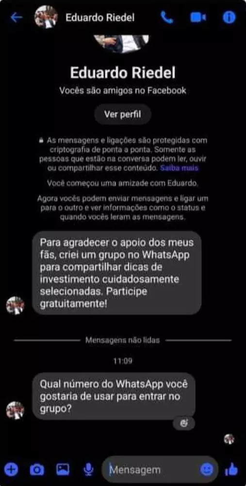 Segundo o Executivo, os conteúdos são divulgados por perfis falsos e convidam usuários a ingressar em grupos de WhatsApp com promessas de dicas de investimento ou participação em programas inexistentes.