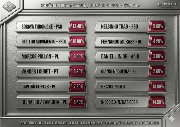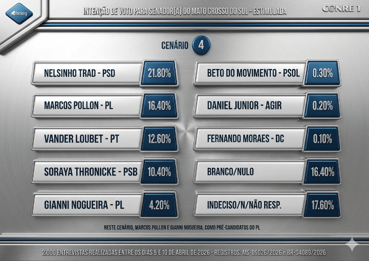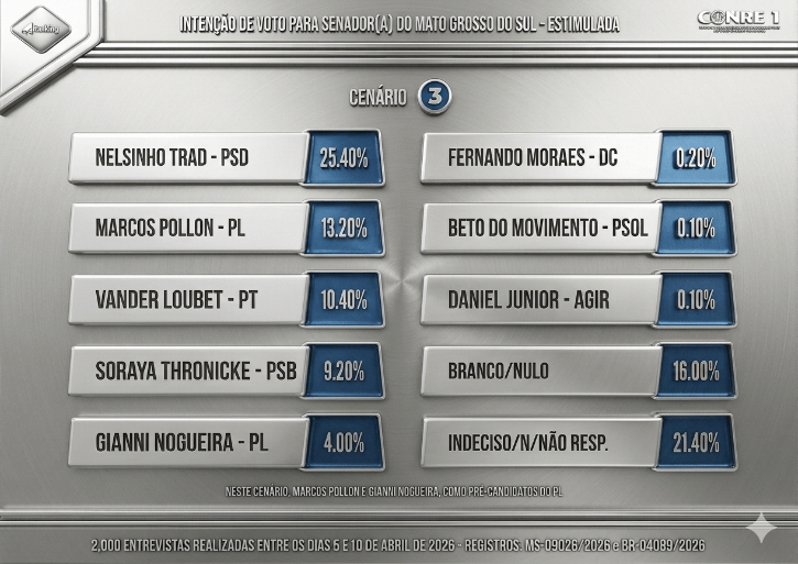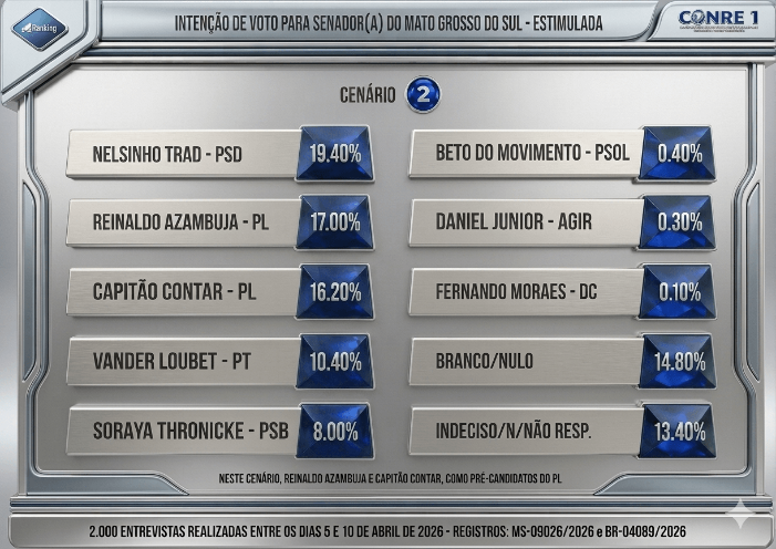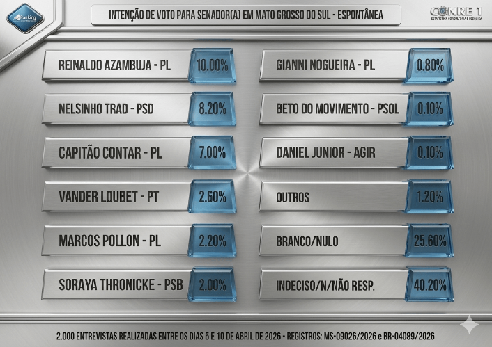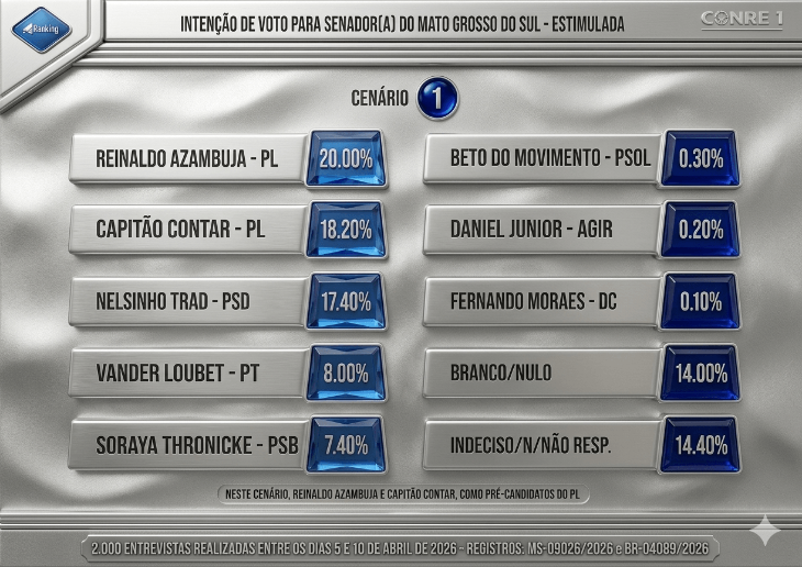 Pesquisa divulgada recentemente pelo Instituto Ranking Brasil Inteligência, registrada sob os números MS-09026/2026 e BR-04089/2026, realizada entre os dias 5 e 10 de abril deste ano, com 2.000 moradores de 16 anos ou mais de idade, em 30 municípios de Mato Grosso do Sul, revela que o ex-governador Reinaldo Azambuja (PL), lidera as intenções de votos para o senado federal.