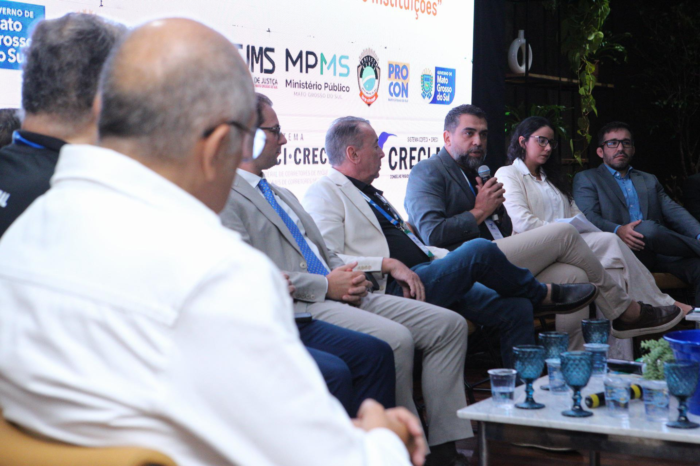 O Promotor de Justiça do Ministério Público de Mato Grosso do Sul (MPMS), Pedro de Oliveira Magalhães e os Promotores Substitutos Gabriela Rabelo Vasconcelos e Felipe Rocha Vasconcellos de Freitas Pinheiro, participaram do encontro e contribuíram com reflexões sobre a importância do cumprimento das normas legais no setor imobiliário, o papel fiscalizatório do MPMS e a construção de estratégias interinstitucionais para a defesa da ordem urbanística e dos direitos dos consumidores.